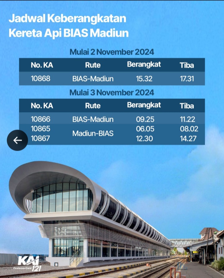 PT Kereta Api Indonesia (KAI) Daerah Operasi (Daop) 6 Yogyakarta mengoperasikan kereta api (KA) Bandara Internasional Adi Soemarmo (BIAS) Madiun relasi Stasiun Bandara Adi Soemarmo-Madiun (pulang pergi/PP). KA BIAS Madiun rute Stasiun Bandara Adi Soemarmo-Madiun pertama kali dioperasikan pada Sabtu, 2 November 2024 dengan keberangkatan dari Bandara Adi Soemarmo pukul 15.32 WIB.